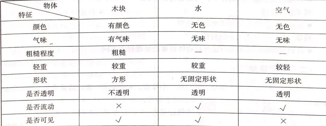 12. 固体的特征:有固定的形状,不会流动(有些固体颗粒很小,比如面粉、沙子和食盐,它们也有固定的形状);液体的特征:没有固定的形状,会流动;空气的特征:很轻(有重量),没有固定形状,会流动,看不见摸不着。