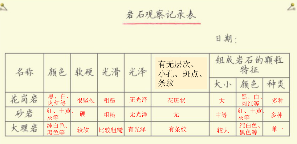 2. 观察物体的方法:用眼看(形状、大小、颜色、是否透明),用手摸(粗糙程度),用鼻子闻(气味),用手掂一掂(重量)。
