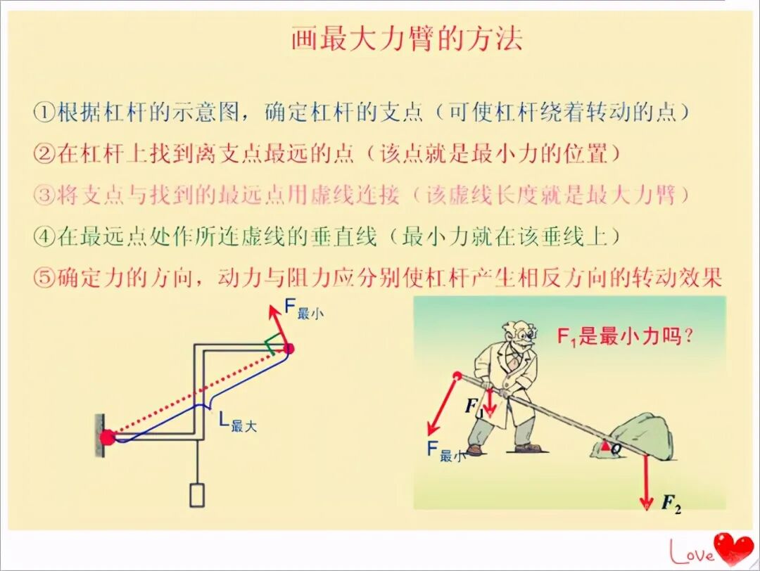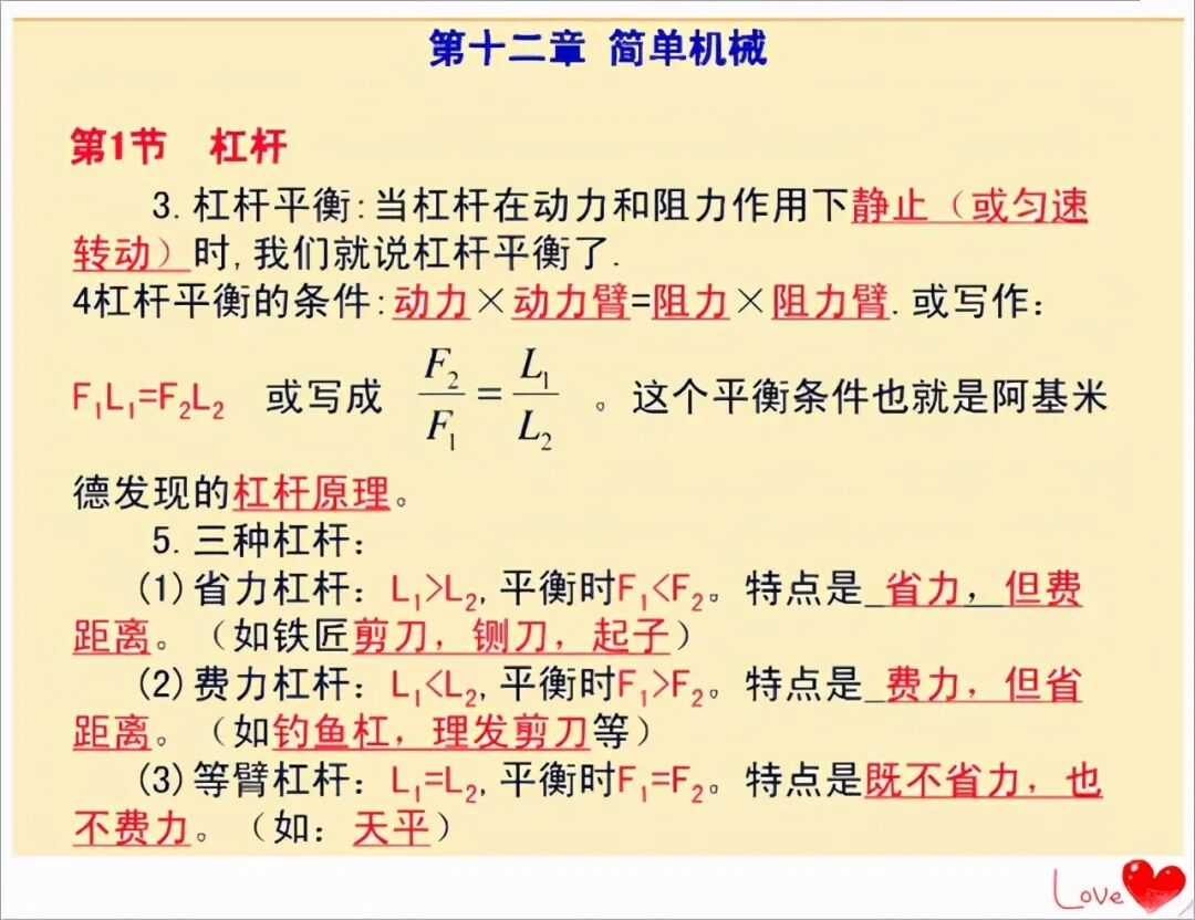 (1)省力杠杆:L1>L2,F1<F2(省力费距离,如:撬棒、铡刀、动滑轮、轮轴、羊角锤、钢丝钳、手推车、花枝剪刀。)