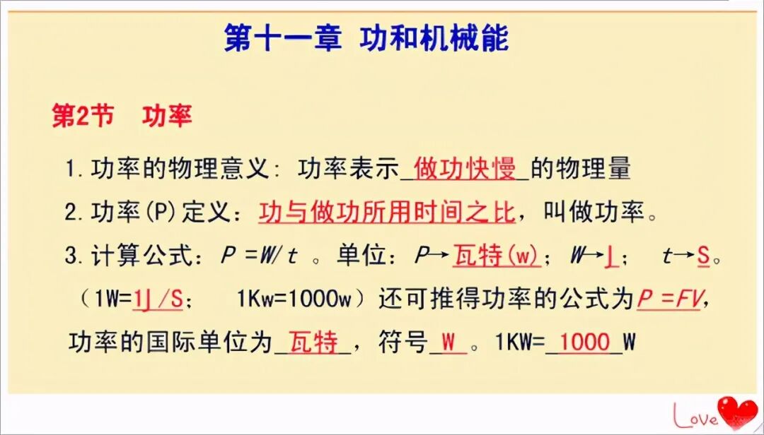 4、功率的单位是瓦特(简称瓦,符号W)、千瓦(kW)1W=1J/s、1kW=103W。