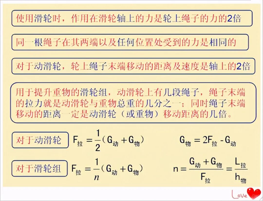 ④对理想的定滑轮(不计轮轴间摩擦)F=G物。绳子自由端移动距离SF(或速度vF)=重物移动的距离SG(或速度vG)