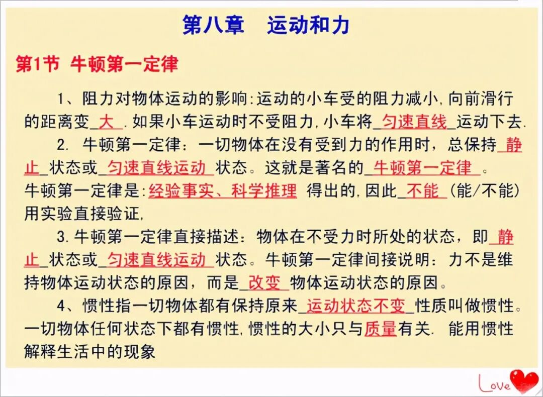 1、阻力对物体运动的影响:让同一小车从同一斜面的同一高度自由滑下(控制变量法),是为了使小车滑到斜面底端时有相同的速度;阻力的大小用小车在木板上滑动的距离的长短来体现(转化法)。