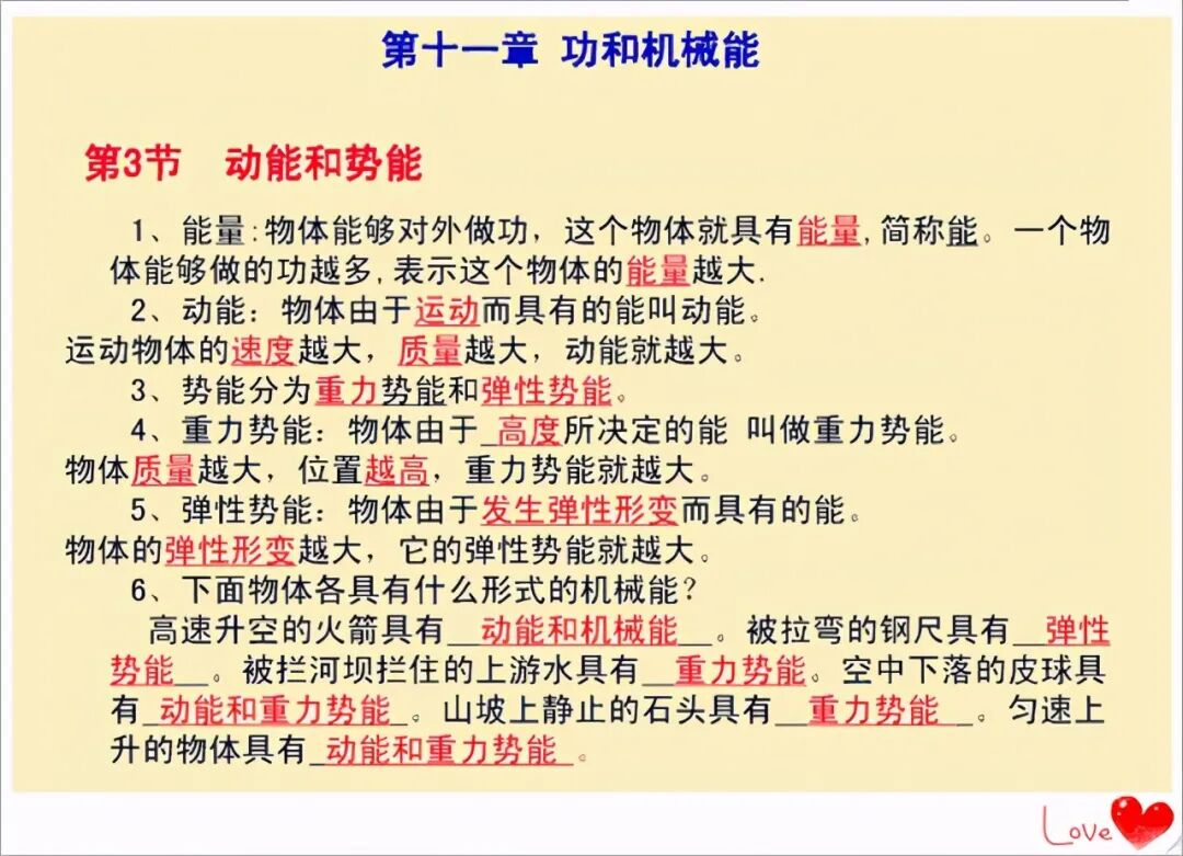 3、一切运动的物体都具有动能,静止的物体动能为零,匀速运动且质量一定的物体(不论匀速上升、匀速下降,匀速前进、匀速后退,只要是匀速)动能不变。物体是否具有动能的标志是:是否在运动。