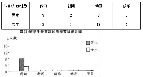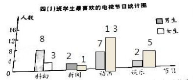 喜欢动画节目的人最多,所以动画最受四(1)班学生欢迎喜欢,男生最喜欢科幻电视节目;