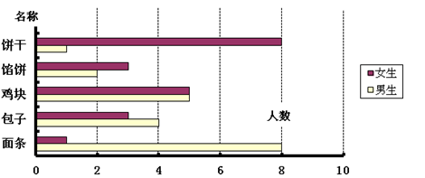 性别 人数 食物 | 饼干 | 馅饼 | 鸡块 | 包子 | 面条 |