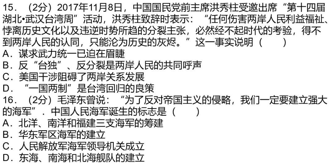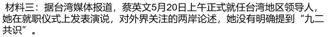 (4)感想:台湾是中国领土不可分割的一部分;国家统一是不可阻挡的历史潮流;反对任何分裂祖国,阻挠统一的行为。(2分,言之有理,答出两点即可得分。)