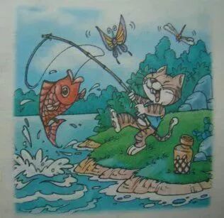 小猫想吃鱼,它带上鱼竿来到河边钓鱼。一会儿,它掉到了一条又红又大的鱼。这时天空中飞来飞去的蝴蝶和蜻蜓也飞来跟小猫打招呼,仿佛夸奖小猫真能干。