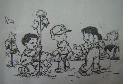 植树节到了,小明、小军和小丽一起来到公园的小山坡上种树。小明用铲子在地上挖了树坑,小军把树放进去,然后小明给它填土,等到快种好了,小丽提着桶说:“我来给小树浇水。”