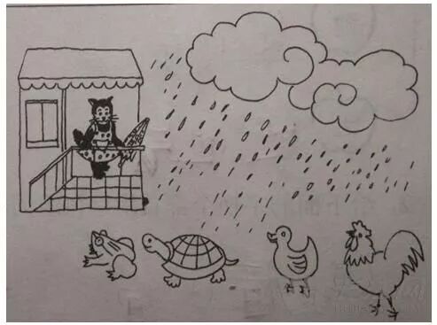 一天,青蛙、乌龟、鸭子和大公鸡准备到好朋友小山羊的家里去做客。忽然,天上乌云密布,马上就下起了倾盆大雨。小动物们只能冒雨走着。
