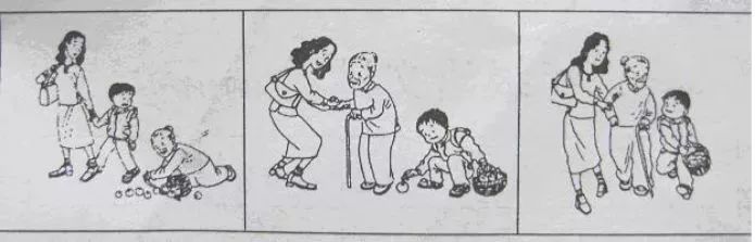 放学后,小军和妈妈一起回家,路上一位老奶奶不小心摔倒了,她买的橘子撒了一地。妈妈连忙扶起了老奶奶,小军把掉在地上的橘子捡进了篮子里。最后,他和妈妈一起送老奶奶回家。