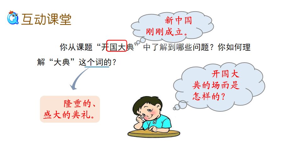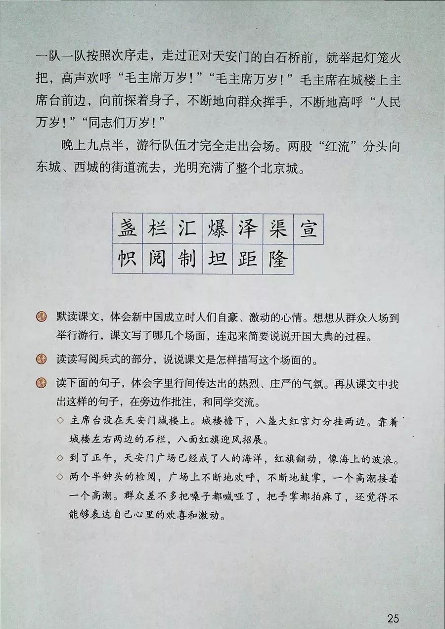 1、默读课文,体会新中国成立时人们自豪、激动的心情。想想从群众入场到举行游行,课文写了哪几个场面,连起来简要说说开国大典的过程。