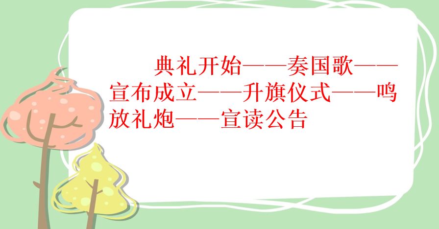 过程:1949年10月1日,中华人民共和国中央人民政府成立,在首都天安门广场举行典礼。下午三点整,典礼开始,首先奏国歌,接着毛泽东宣布:“中华人民共和国中央人民政府在今天成立了!”然后,升国旗。升旗以后,毛泽东宣读了中央人民政府公告。宣读公告完毕,阅兵式开始。受检阅的有海军、步兵、炮兵、战车、骑兵,还有人民空军的飞机。阅兵式之后,开始游行。