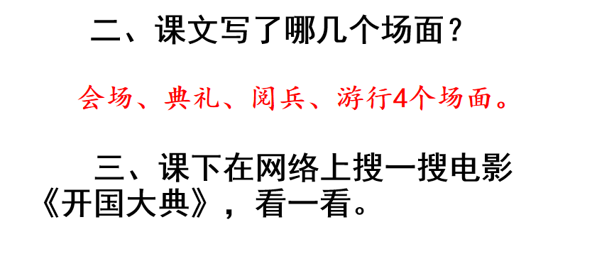 1.文章主要写了哪几个场面,连起来简要说说开国大典的过程。
