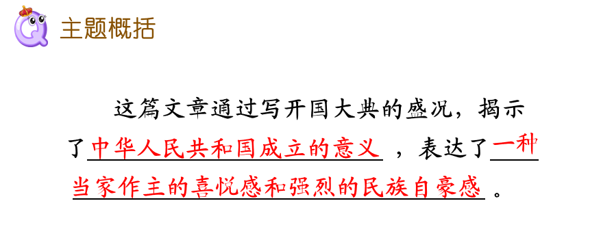 3、在记叙开国大典开始前的这一部分,课文先交代了举行开国大典的时间、地点和参加典礼的人员、人数,然后描述了会场的布置和群众队伍的场面。写出了典礼的盛大和隆重,参加典礼的人们那种激动、兴奋的心情。