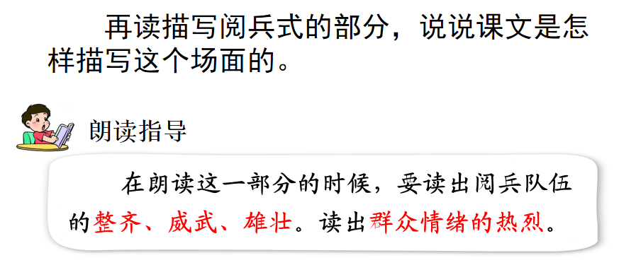 2、读读写阅兵式的部分,说说课文是怎样描写这个场面的。