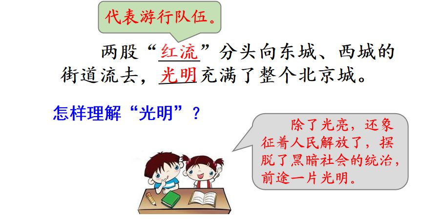 这“光明”,不仅是指灯笼火把照亮了北京城,而且象征着中华人民共和国的成立,使北京城永远摆脱了过去的黑暗统治,获得了光明。