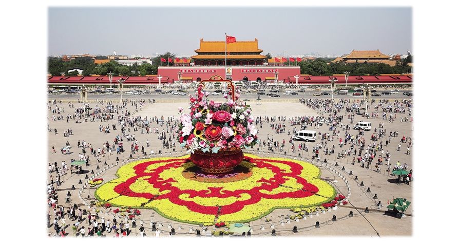 宽阔的上,华灯还在淡淡的晨雾中闪烁,成千上万的人已从四面八方汇集到天安门广场,急切地等待着中华人民共和国国庆日升旗仪式这一庄严时刻的到来。