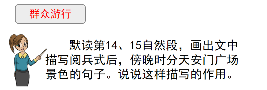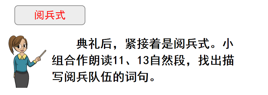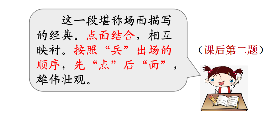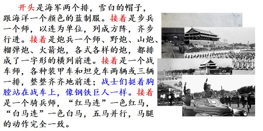 描写受阅部队时,课文按照“兵”出场的顺序依次描写,描写过程中注意点面结合,相互映衬,先“点”后“面”, 雄伟壮观。分别介绍“海军”、“炮兵”等各个方队,这是“点”;然后总写这些部队全部以相等的距离和相同的速度经过主席台前,这是“面”。这种点面结合的方法,不仅让我们感受到了整个阅兵式的庄严、隆重,还让我们对各具特色的队伍留下了深刻的印象。