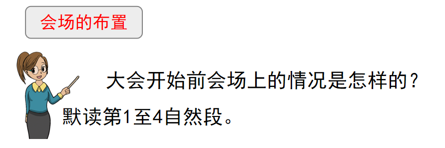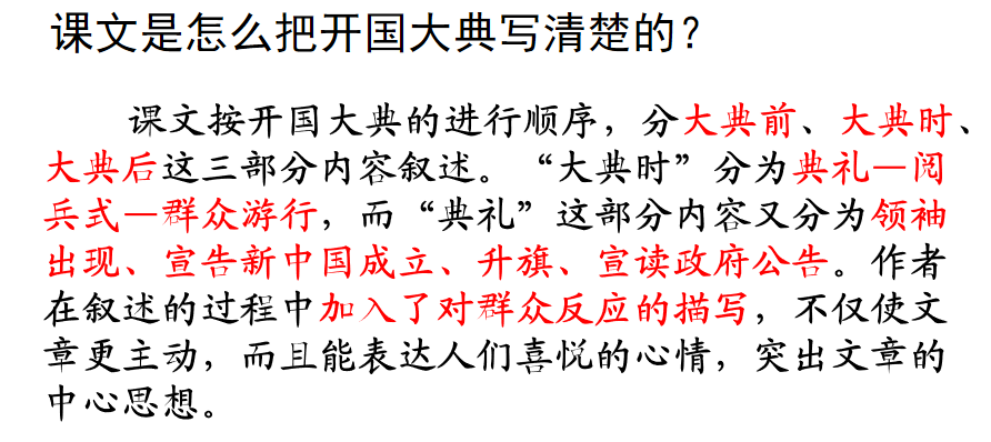 课文按照开国大典进行的顺序叙述。先讲大会开始前会场上的情况;然后讲典礼的主体部分──毛泽东宣布中华人民共和国中央人民政府成立、升国旗、宣读中央人民政府公告;接着讲阅兵式的盛况;最后讲群众游行。(着重描写群众入场情况、典礼仪式、阅兵式、群众游行四个场面,有详有略,但都蔚为壮观)