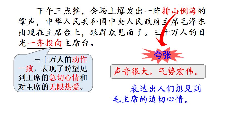 4、典礼临近开始,当毛主席出现在主席台上时,“会场上爆发出一阵排山倒海的掌声”,“三十万人的目光一齐投向主席台”,这显然表现了人民群众对领袖的无比拥戴,对新中国的无限热爱。