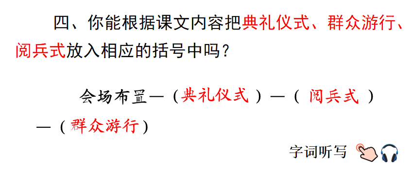 八、 课文着重写了开国大典的四个场面,请补全另外两项。