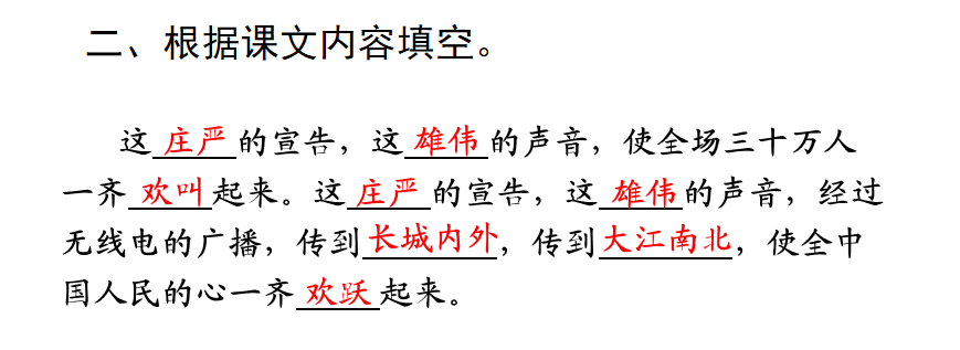 5、当毛主席宣布“中华人民共和国中央人民政府今天成立了”之后,课文用“这庄严的宣告,这雄伟的声音…”两个句子,表现了人民为新中国的诞生而欢欣鼓舞的心情。