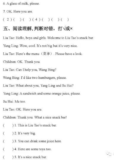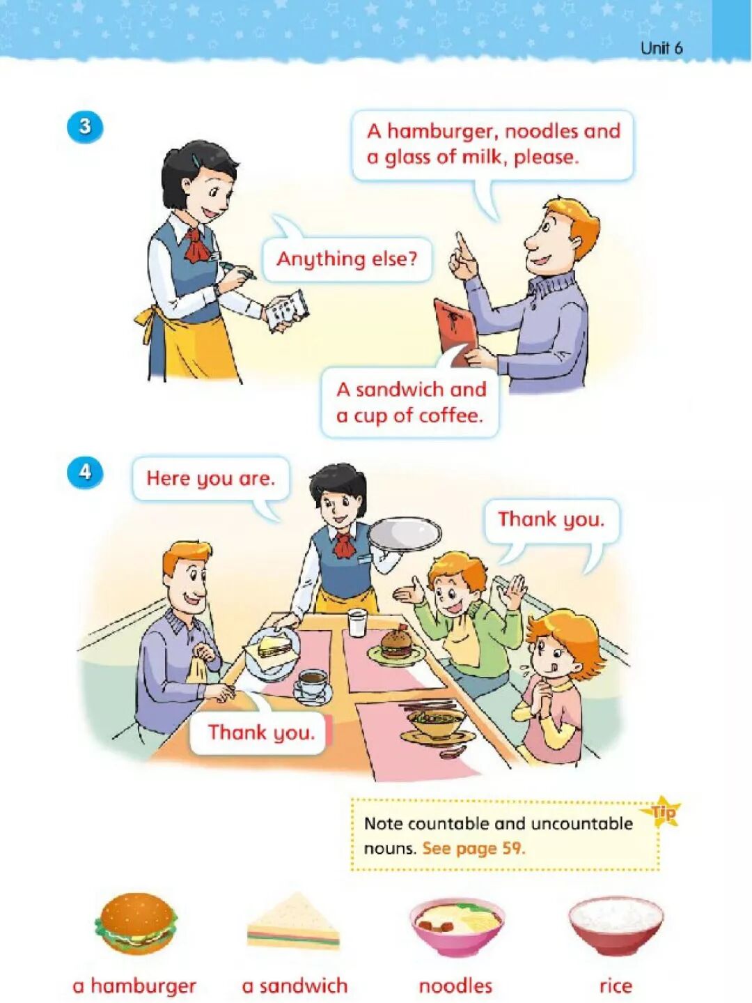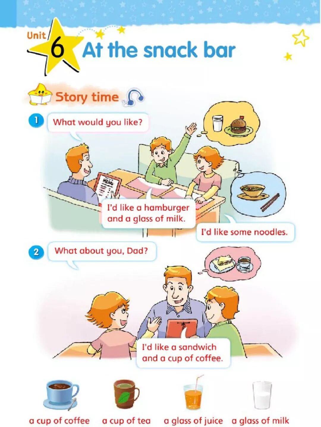 ❹ What would you like, Liu Tao? I’d like a hamburger and a glass of milk.