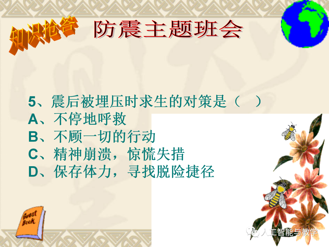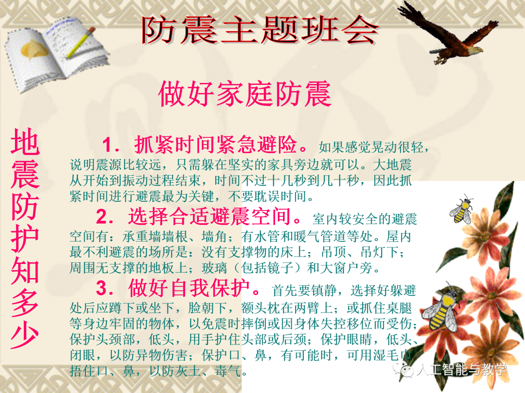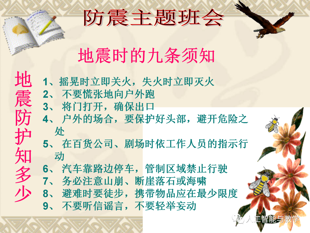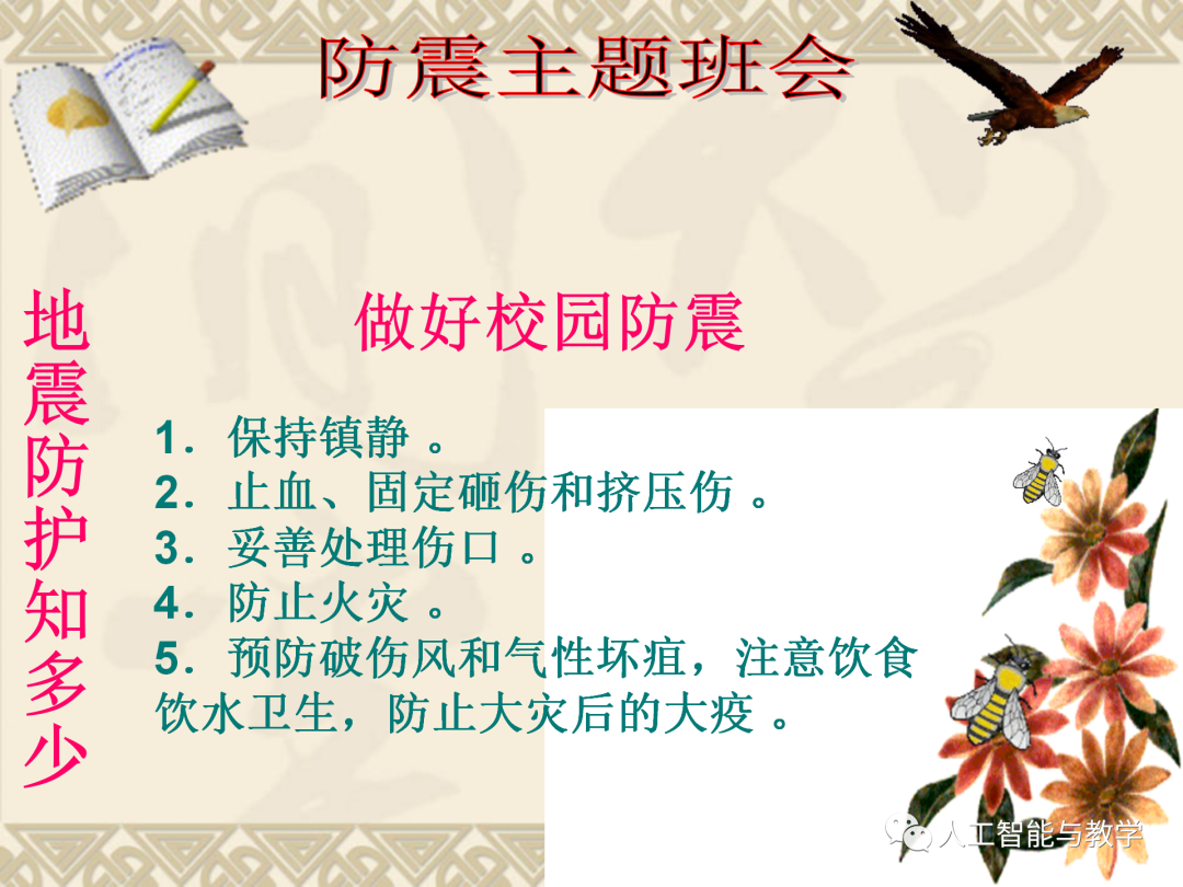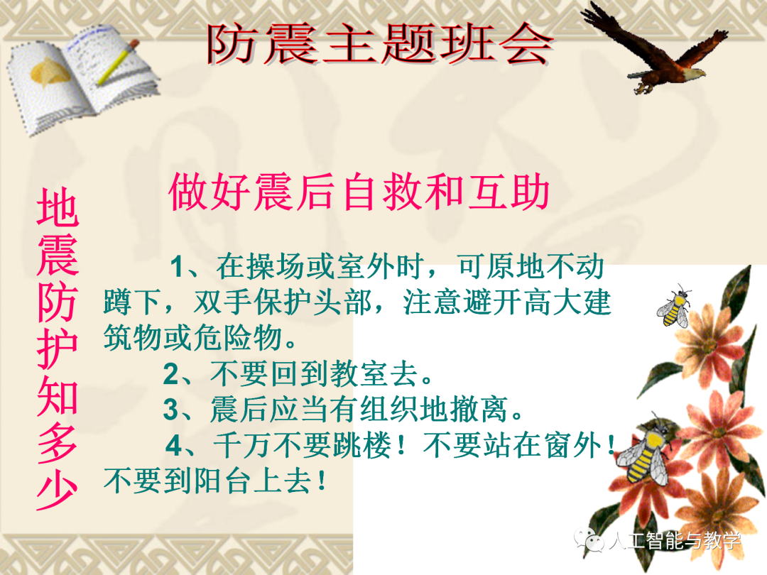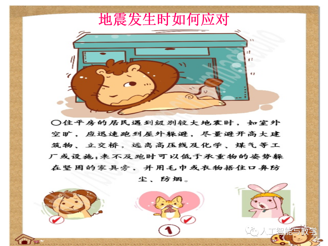 《防震自救》主题班会教案 一、目标: 通过学习,让学生对能够了解一些基本常识,结合 “全国防灾减灾日”开展活动,进一步强化学校安全教育工作,帮助学生树立安全意识、掌握安全知识、提高自我保护能力,保证学校的教育教学工作健康有序的开展。 二、内容简介 1.“防灾减灾日”意义。 2.对我国影响较大的几种自然灾害 3.常见灾害及预防自救、自护常识 三、活动过程 ⅰ.活动背景 ①各小队相互交流,了解地震的成因。 ②播放地震成因影片。 ③学生出示搜集到的有关地震知识。 学生4:我国川、滇、黔接壤地带,该地带现代地壳活动强烈,地震濒发,震级高。由于地壳活动强烈,山体中断裂发育,岩石破碎,风化严重,加上干湿季节分明,暴雨集中。促使滑坡、泥石流灾害突发。这次四川发生了8.0级的地震,震后到目前为止,还发生了四次6级以上的余震,以唐山大地震的破坏性更大。 ④初步了解各种地质灾害的关联性。 各种地质灾害既具有各自形成、发展、致灾的规律,各灾害之间以及它们与 其他因素之间又有一定的关联性。一个地域内的地质灾害可能有若干种,它们在成因上是有关联的。例如,在一次灾害发生过程中,往往有一种原发性的主灾诱发其他灾害,例如,地震因毁坏生产和生活设施而成灾,同时造成地裂,并引发火灾,又由于人员伤亡和医疗设施的破坏,可能会引起疫病曼延等。人类活动及其对自然环境施加的影响,可以间接或直接诱发地质灾害。例如,人类对植被的破坏,使地表径流的水量和速度加大,是泥石流日趋频繁的重要原因。人类大规模的工程活动,造成滑坡等灾害的事件时有发生。 ⑤地质灾害的防御 当今世界,由于人口快速增长和经济密集发展,加之人类对自然环境的破坏日益严重,地质灾害发生的频度和成灾的强度不断提高。这已引起了世界各国政府和人民的广泛关注。 学生5:加强地质灾害的科学研究,建立灾情监测预报系统。 学生6:加强地质灾害的管理,建立健全减灾工作的政策法规体系。 学生7:实施一些预防措施。例如,提高建筑物的抗震强度;实施护坡工程,防止滑坡和崩塌。除采取工程措施外,还可进行植树造林等综合治理措施,如通过恢复地表植被,改善生态环境,治理水土流失,以减少泥石流或滑坡的发生频率和强度。 学生8:积极开展防灾、减灾的宣传教育,提高公众的环保意识和减灾意识,能够更有效地开展和做好防灾、减灾工作。 ⅱ、“防灾减灾日”意义 我国是世界上自然灾害最为严重的国家之一,灾害种类多、分布地域广、发生频率高、造成损失重。 自2009年起,国务院确定每年的5月12日为“防灾减灾日”。 2008年5月12日,我国四川汶川发生8.0级特大地震,损失影响之大,举世震惊。设立我国的“防灾减灾日”,一方面是顺应社会各界对我国防灾减灾关注的诉求,另一方面也是提醒国民前事不忘,后事之师,更加重视防灾减灾,努力减少灾害损失。国家设立“防灾减灾日”,将使我国的防灾减灾工作更有针对性,更加有效地开展防灾减灾工作。 ⅲ、对我国影响最大的几种自然灾害 地质灾害:种类有:泥石流、滑坡、崩塌、地面下沉、地震。 洪涝及其它灾害:雨涝灾害、洪水灾害、凌汛灾害、地震灾害。 大风灾害:风力达到足以危害人们的生产活动、经济建设和日常生活的风,成为大风。危害性大风主要指台风、寒潮大风、雷暴大风、龙卷风。 热带气旋灾害:我国是世界上少数几个受热带气旋严重影响的国家之一。冰雹灾害:我国是世界上雹灾较多的国家之一。 ⅳ、常见严重灾害的防护 (一)地震时该怎样办 1.躲在桌子等坚固家具的下面 大的地震晃动时间约为1分钟左右。首先,在重心较低、且结实牢固的桌子下面躲避,并紧紧抓牢桌子腿。在没有桌子等可供藏身的场合,无论如何,也要用坐垫等物保护好头部。 2.不要慌张地向户外跑 地震发生后,慌慌张张地向外跑,碎玻璃、屋顶上的砖瓦、广告牌等掉下来砸在身上,是很危险的。此外,水泥预制板墙、自动售货机等也有倒塌的危险,不要靠近这些物体。 3.将门打开,确保出口 钢筋水泥结构的房屋等,由于地震的晃动会造成门窗错位,打不开门,曾经发生有人被封闭在屋子里的事例。请将门打开,确保出口。 4.户外的场合,要保护好头部,避开危险之处 在繁华街、楼区,最危险的是玻璃窗、广告牌等物掉落下来砸伤人。要注意用手或手提包等物保护好头部。在楼区时,根据情况,进入建筑物中躲避比较安全。 5.地震发生后应当采取哪些自救措施? 大地震中被倒塌建筑物压埋的人,只要神志清醒,身体没有重大创伤,都应该坚定获救的信心,妥善保护好自己,积极实施自救。 a. 要尽量用湿毛巾、衣物或其他布料捂住口、鼻和头部,防止灰尘呛闷发生窒息,也可以避免建筑物进一步倒塌造成的伤害。 b. 尽量活动手、脚,清除脸上的灰土和压在身上的物件。 c. 用周围可以挪动的物品支撑身体上方的重物,避免进一步塌落;扩大活动空间,保持足够的空气。 d. 几个人同时被压埋时,要互相鼓励,共同计划,团结配合,必要时采取脱险行动。e. 寻找和开避通道,设法逃离险境,朝着有光亮更安全宽敞的地方移动 f. 一时无法脱险,要尽量节省气力。如能找到代用品和水,要计划着节约使用,尽量延长生存时间,等待获救。g. 保存体力,不要盲目大声呼救。在周围十分安静,或听到上面(外面)有人活动时,用砖
