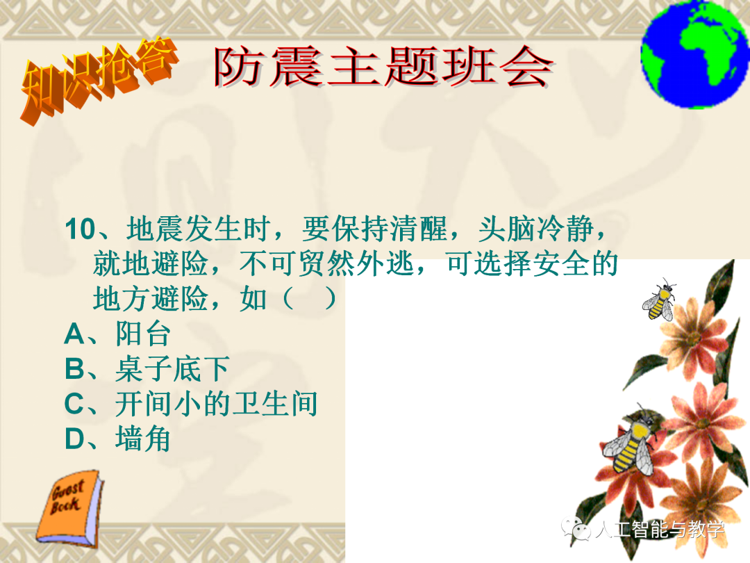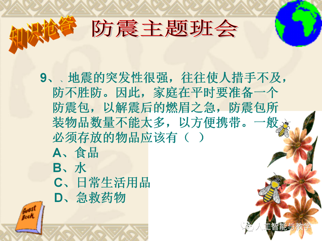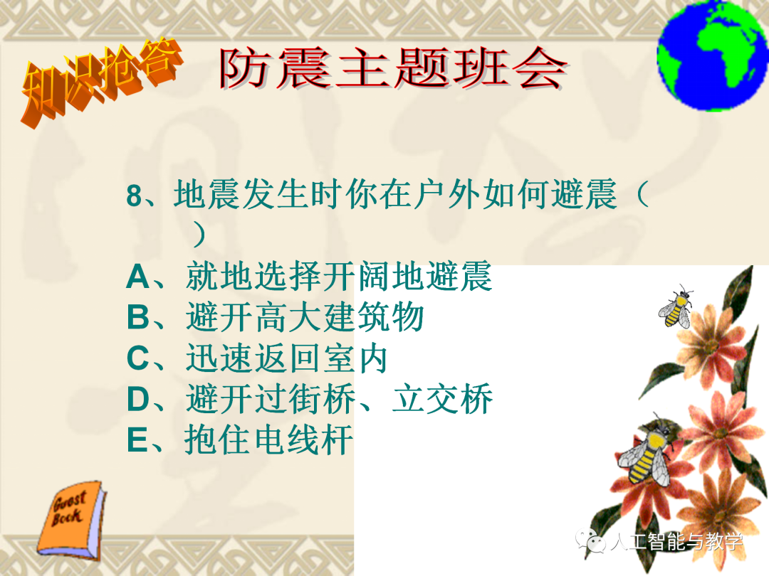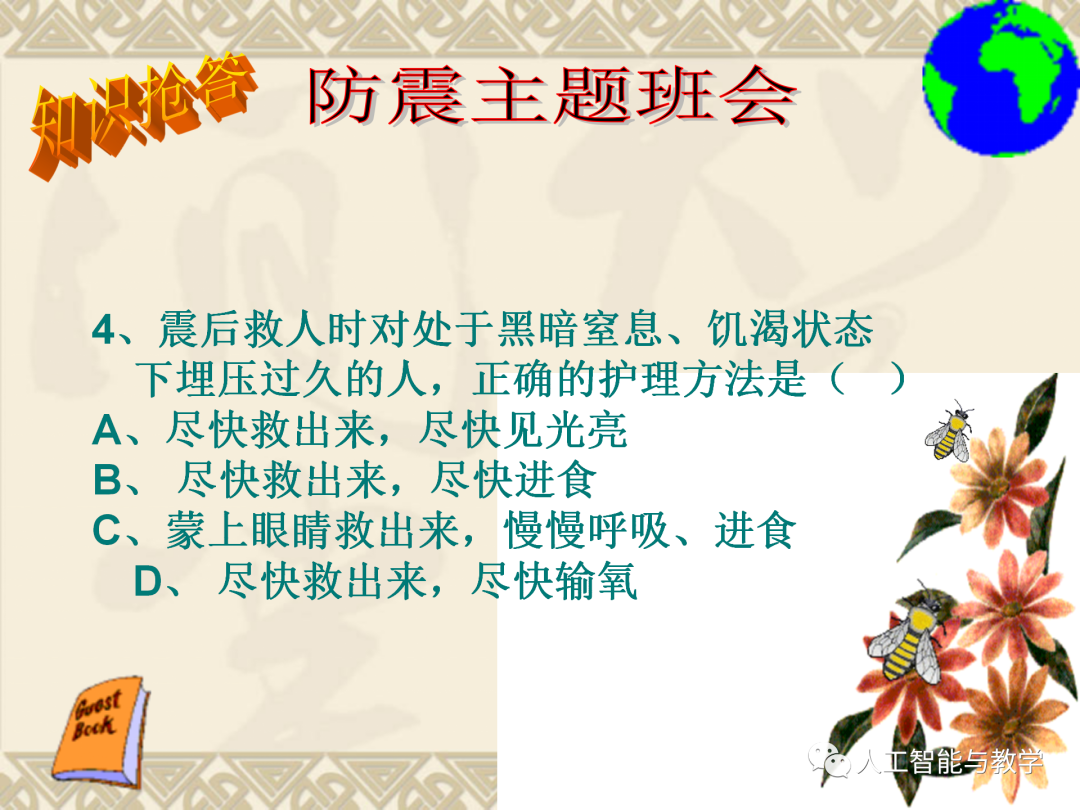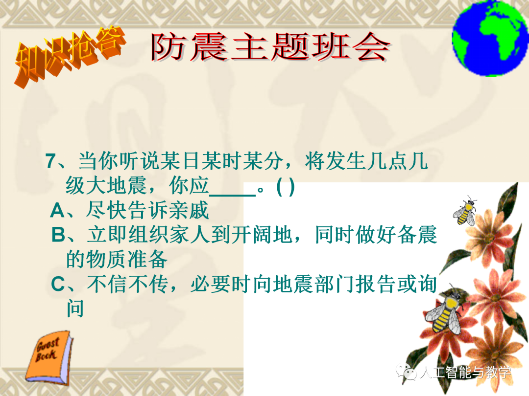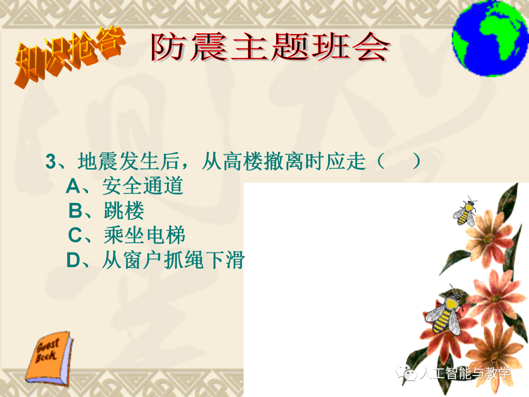 《防震自救》主题班会教案 一、目标: 通过学习,让学生对能够了解一些基本常识,结合 “全国防灾减灾日”开展活动,进一步强化学校安全教育工作,帮助学生树立安全意识、掌握安全知识、提高自我保护能力,保证学校的教育教学工作健康有序的开展。 二、内容简介 1.“防灾减灾日”意义。 2.对我国影响较大的几种自然灾害 3.常见灾害及预防自救、自护常识 三、活动过程 ⅰ.活动背景 ①各小队相互交流,了解地震的成因。 ②播放地震成因影片。 ③学生出示搜集到的有关地震知识。 学生4:我国川、滇、黔接壤地带,该地带现代地壳活动强烈,地震濒发,震级高。由于地壳活动强烈,山体中断裂发育,岩石破碎,风化严重,加上干湿季节分明,暴雨集中。促使滑坡、泥石流灾害突发。这次四川发生了8.0级的地震,震后到目前为止,还发生了四次6级以上的余震,以唐山大地震的破坏性更大。 ④初步了解各种地质灾害的关联性。 各种地质灾害既具有各自形成、发展、致灾的规律,各灾害之间以及它们与 其他因素之间又有一定的关联性。一个地域内的地质灾害可能有若干种,它们在成因上是有关联的。例如,在一次灾害发生过程中,往往有一种原发性的主灾诱发其他灾害,例如,地震因毁坏生产和生活设施而成灾,同时造成地裂,并引发火灾,又由于人员伤亡和医疗设施的破坏,可能会引起疫病曼延等。人类活动及其对自然环境施加的影响,可以间接或直接诱发地质灾害。例如,人类对植被的破坏,使地表径流的水量和速度加大,是泥石流日趋频繁的重要原因。人类大规模的工程活动,造成滑坡等灾害的事件时有发生。 ⑤地质灾害的防御 当今世界,由于人口快速增长和经济密集发展,加之人类对自然环境的破坏日益严重,地质灾害发生的频度和成灾的强度不断提高。这已引起了世界各国政府和人民的广泛关注。 学生5:加强地质灾害的科学研究,建立灾情监测预报系统。 学生6:加强地质灾害的管理,建立健全减灾工作的政策法规体系。 学生7:实施一些预防措施。例如,提高建筑物的抗震强度;实施护坡工程,防止滑坡和崩塌。除采取工程措施外,还可进行植树造林等综合治理措施,如通过恢复地表植被,改善生态环境,治理水土流失,以减少泥石流或滑坡的发生频率和强度。 学生8:积极开展防灾、减灾的宣传教育,提高公众的环保意识和减灾意识,能够更有效地开展和做好防灾、减灾工作。 ⅱ、“防灾减灾日”意义 我国是世界上自然灾害最为严重的国家之一,灾害种类多、分布地域广、发生频率高、造成损失重。 自2009年起,国务院确定每年的5月12日为“防灾减灾日”。 2008年5月12日,我国四川汶川发生8.0级特大地震,损失影响之大,举世震惊。设立我国的“防灾减灾日”,一方面是顺应社会各界对我国防灾减灾关注的诉求,另一方面也是提醒国民前事不忘,后事之师,更加重视防灾减灾,努力减少灾害损失。国家设立“防灾减灾日”,将使我国的防灾减灾工作更有针对性,更加有效地开展防灾减灾工作。 ⅲ、对我国影响最大的几种自然灾害 地质灾害:种类有:泥石流、滑坡、崩塌、地面下沉、地震。 洪涝及其它灾害:雨涝灾害、洪水灾害、凌汛灾害、地震灾害。 大风灾害:风力达到足以危害人们的生产活动、经济建设和日常生活的风,成为大风。危害性大风主要指台风、寒潮大风、雷暴大风、龙卷风。 热带气旋灾害:我国是世界上少数几个受热带气旋严重影响的国家之一。冰雹灾害:我国是世界上雹灾较多的国家之一。 ⅳ、常见严重灾害的防护 (一)地震时该怎样办 1.躲在桌子等坚固家具的下面 大的地震晃动时间约为1分钟左右。首先,在重心较低、且结实牢固的桌子下面躲避,并紧紧抓牢桌子腿。在没有桌子等可供藏身的场合,无论如何,也要用坐垫等物保护好头部。 2.不要慌张地向户外跑 地震发生后,慌慌张张地向外跑,碎玻璃、屋顶上的砖瓦、广告牌等掉下来砸在身上,是很危险的。此外,水泥预制板墙、自动售货机等也有倒塌的危险,不要靠近这些物体。 3.将门打开,确保出口 钢筋水泥结构的房屋等,由于地震的晃动会造成门窗错位,打不开门,曾经发生有人被封闭在屋子里的事例。请将门打开,确保出口。 4.户外的场合,要保护好头部,避开危险之处 在繁华街、楼区,最危险的是玻璃窗、广告牌等物掉落下来砸伤人。要注意用手或手提包等物保护好头部。在楼区时,根据情况,进入建筑物中躲避比较安全。 5.地震发生后应当采取哪些自救措施? 大地震中被倒塌建筑物压埋的人,只要神志清醒,身体没有重大创伤,都应该坚定获救的信心,妥善保护好自己,积极实施自救。 a. 要尽量用湿毛巾、衣物或其他布料捂住口、鼻和头部,防止灰尘呛闷发生窒息,也可以避免建筑物进一步倒塌造成的伤害。 b. 尽量活动手、脚,清除脸上的灰土和压在身上的物件。 c. 用周围可以挪动的物品支撑身体上方的重物,避免进一步塌落;扩大活动空间,保持足够的空气。 d. 几个人同时被压埋时,要互相鼓励,共同计划,团结配合,必要时采取脱险行动。e. 寻找和开避通道,设法逃离险境,朝着有光亮更安全宽敞的地方移动 f. 一时无法脱险,要尽量节省气力。如能找到代用品和水,要计划着节约使用,尽量延长生存时间,等待获救。g. 保存体力,不要盲目大声呼救。在周围十分安静,或听到上面(外面)有人活动时,用砖