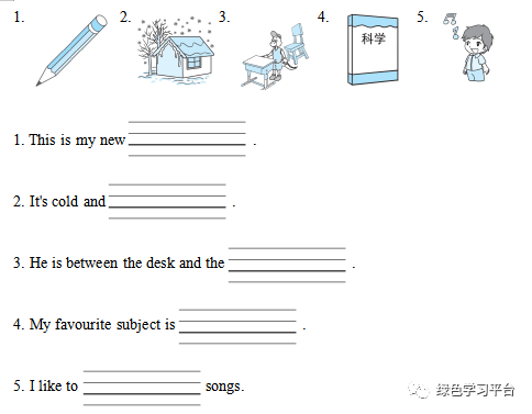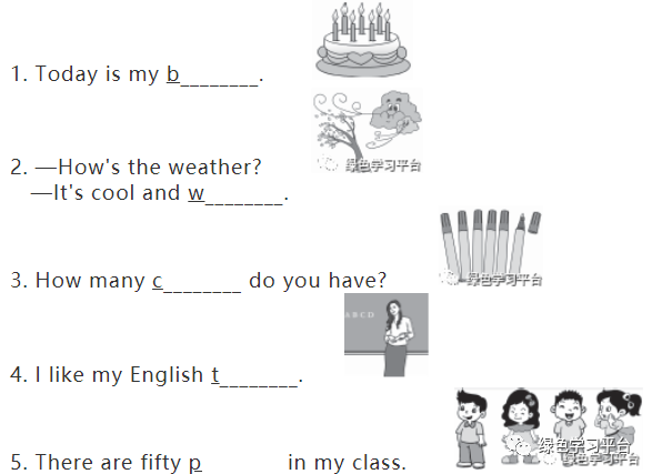 五、根据图片提示将下列句子中的单词补充完整。 (10分)