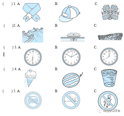 ()1. A. singB. walkC. jump()2. A. second B. stand C. stop()3. A. sleeping B. sitting C. singing()4. A. night B. light C. right()5. A. tomorrow B. yesterday C. now![]()