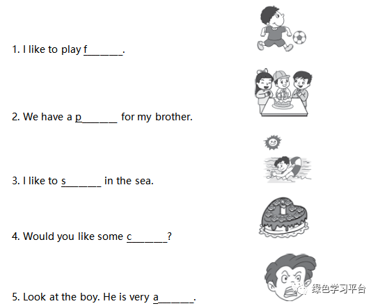 五、根据图片和首字母提示写单词,补全句子。(5分)