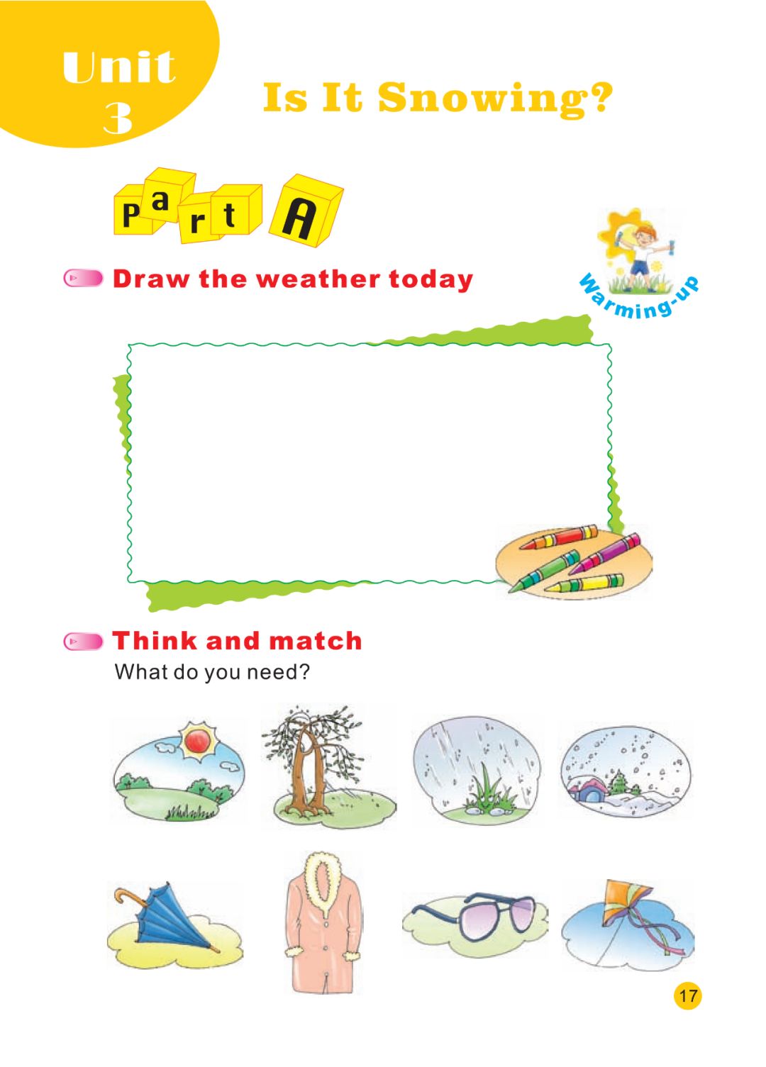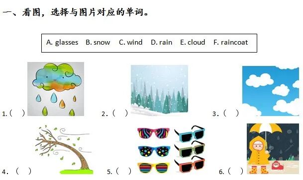 一、1. D 2. B 3. E 4. C 5. A 6. F二、1. raining 2. snowing 3. cloudy 4. snowy三、1.snowman 2. blue sky 3. fly in the sky 4. a pair of glasses