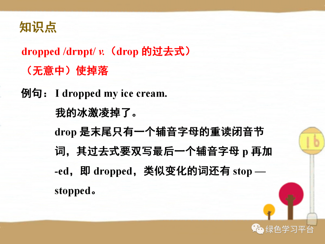 讲解drop (教师拿一本书装做不小心掉在地下) T:Oh. I dropped my book. (告诉学生drop的过去式是dropped)