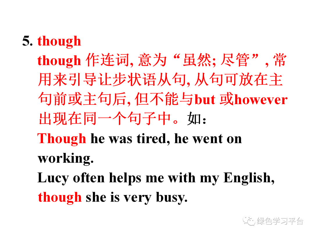 though 作连词, 意为“虽然; 尽管”, 常用来引导让步状语从句, 从句可放在主句前或主句后, 但不能与but 或however 出现在同一个句子中。如: