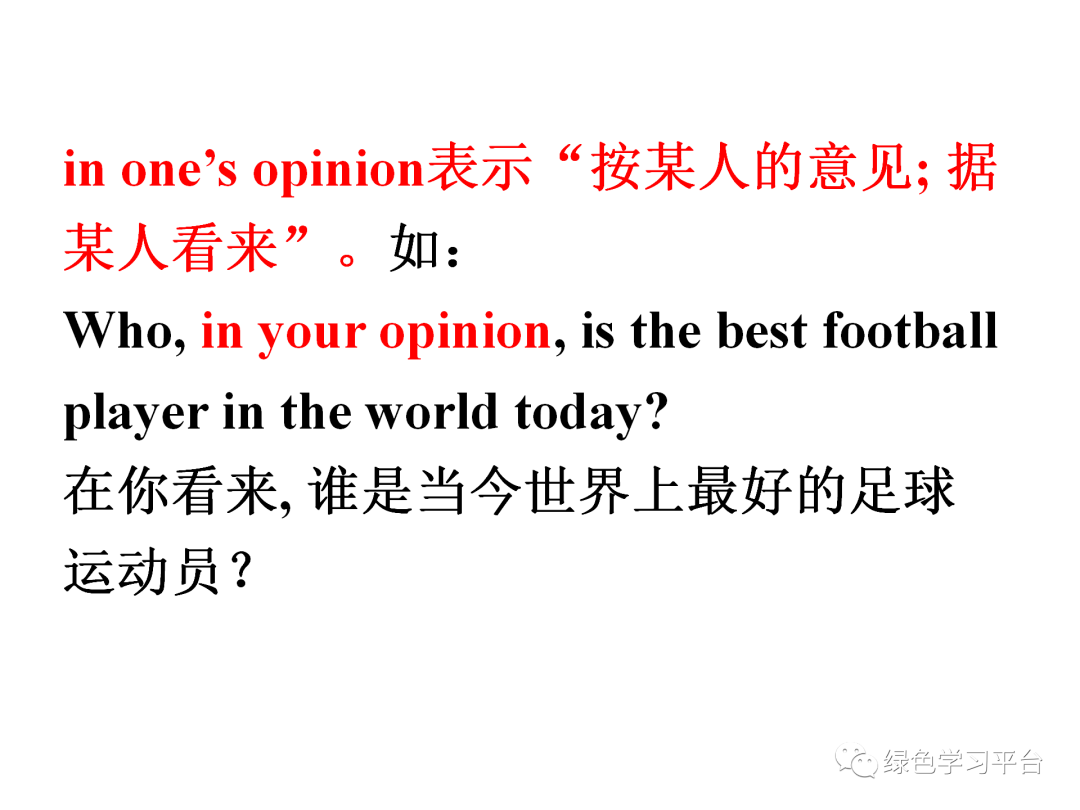 in one’s opinion表示“按某人的意见;据某人看来”。如: