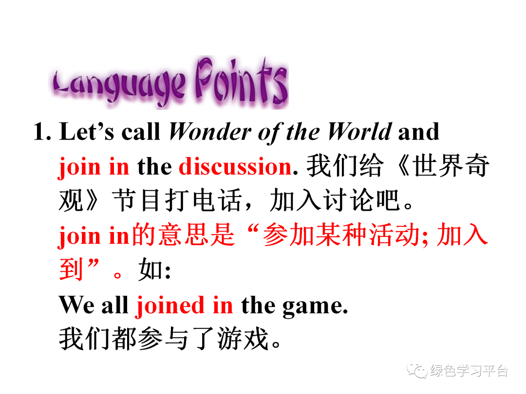 join in的意思是“参加某种活动,加入到”。例如:We all joined in the game. 我们都参与了游戏。