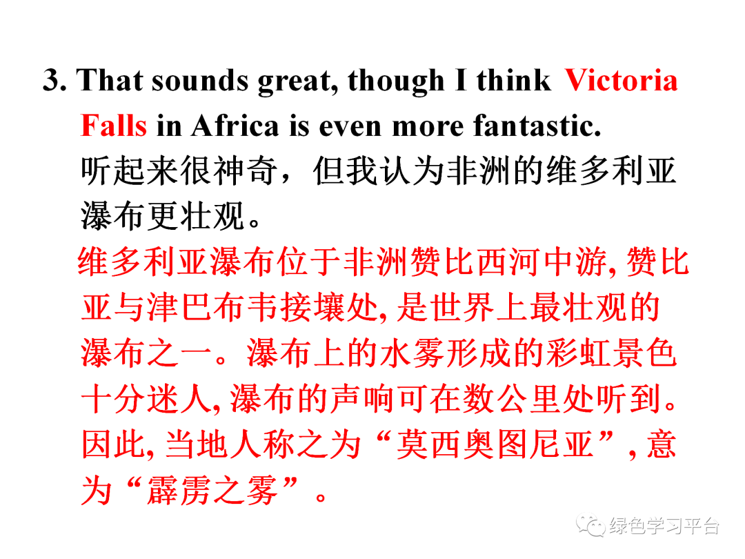 2. 掌握重点句型:That sounds great, though I think Victoria Falls in Africa are even more fantastic.;基数词+量词+long/wide/high…….