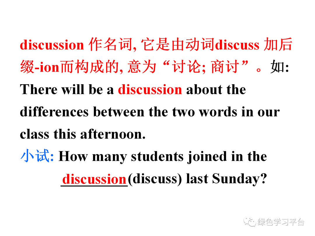 discussion 作名词, 它是由动词discuss 加后缀-ion而构成的, 意为“讨论; 商讨”。如: