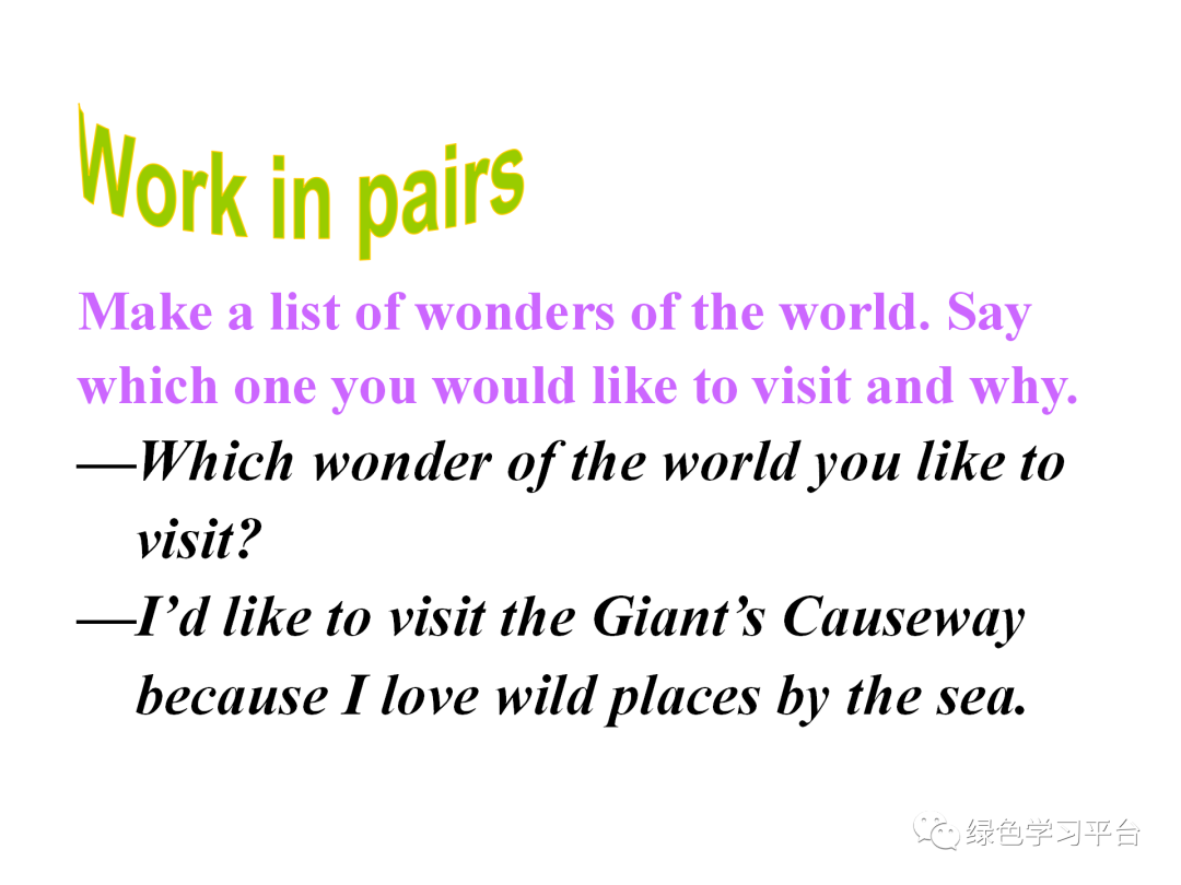 通过学习,掌握如何介绍、描述某一世界奇观,从而使学生更加热爱自然风光。