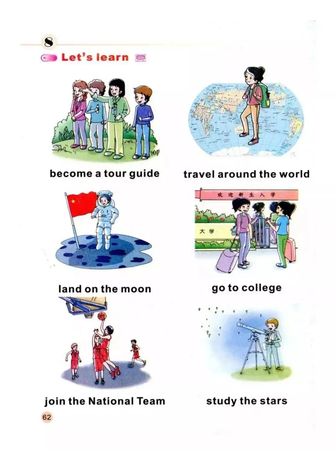 become a tour guide travel around the world land on the moon go to college join the National Team study the stars | 环游世界 登陆月球 上大学 加入国家队 研究星象 |