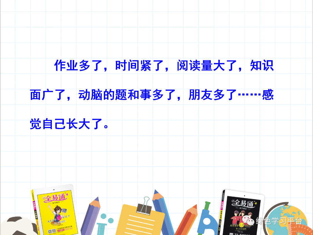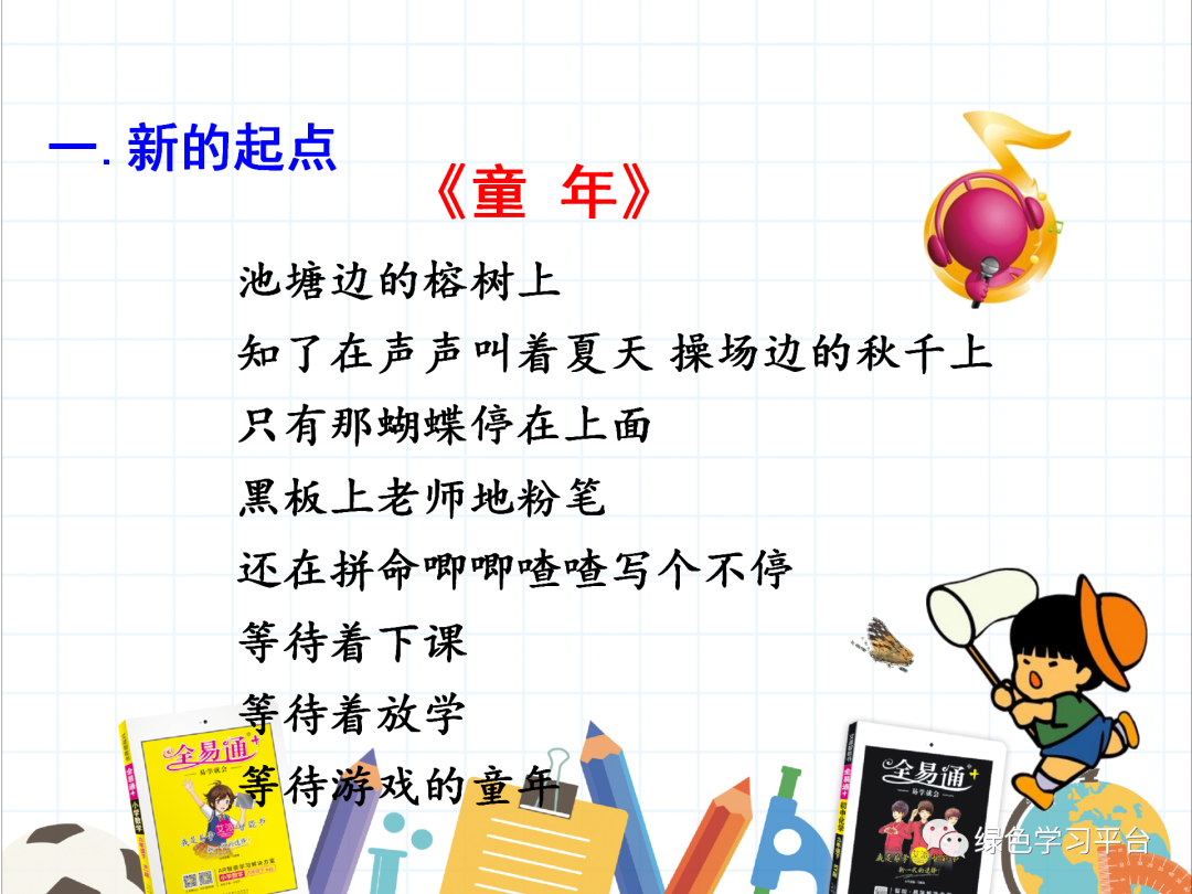 总结提升:不管我们想不想长大,时间的指针不会倒转。今天,我们已经从小学升入了中学,站在新的起点上,我们要以积极的状态投入新的生活和学习之中。