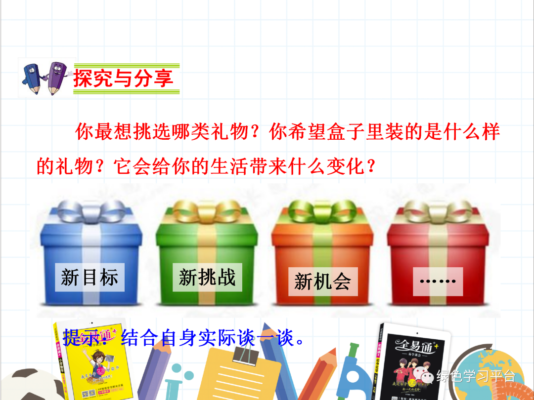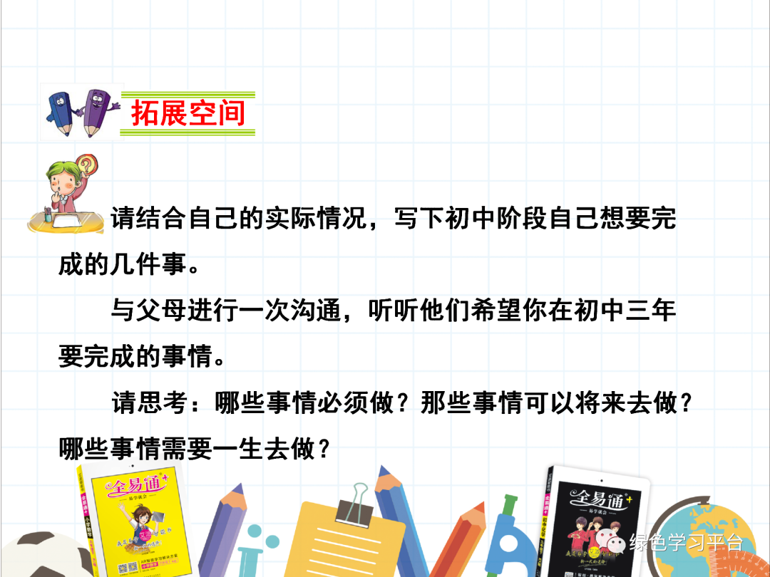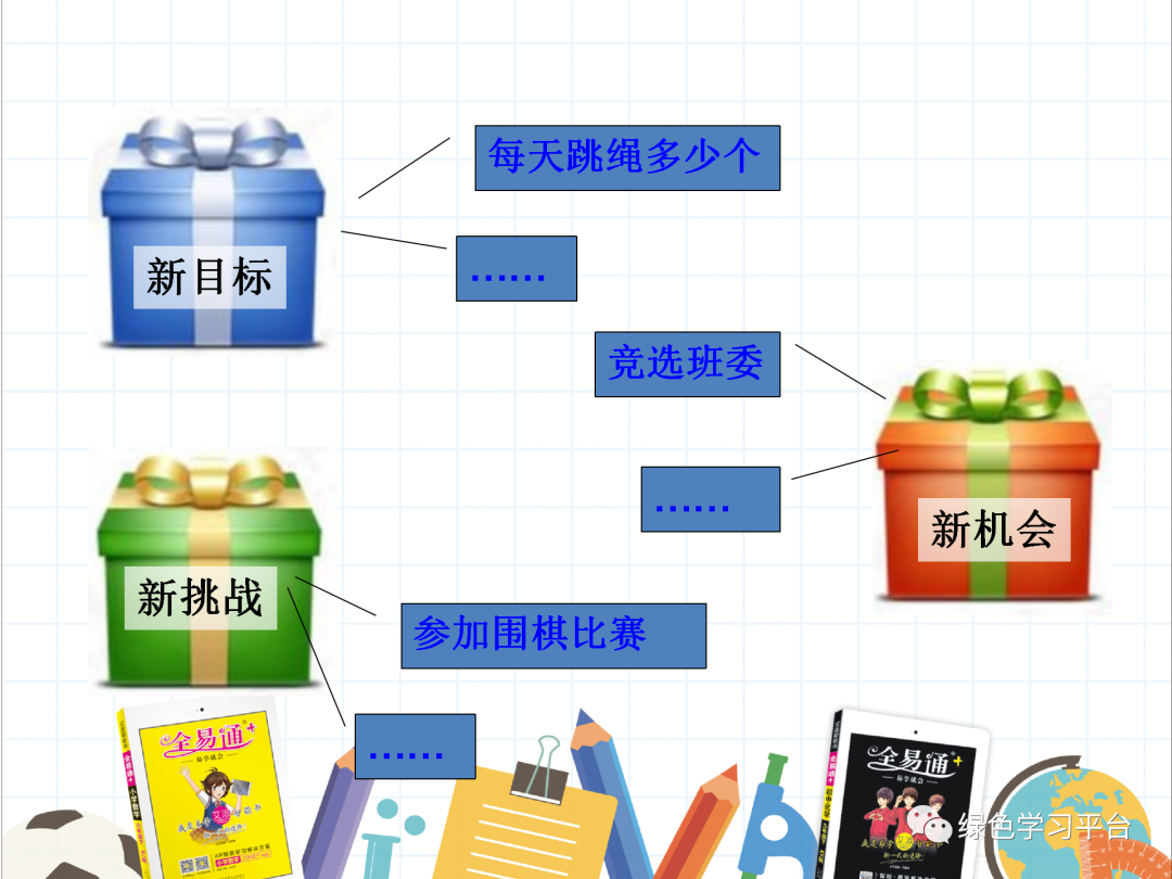 设计意图:意在引导学生换个角度来面对新生活带来的各种变化,使学生不仅能够愉快地接受变化了的生活,而且能促使学生对自己的个人期待更加明确,形成自我激励,学会自我管理。