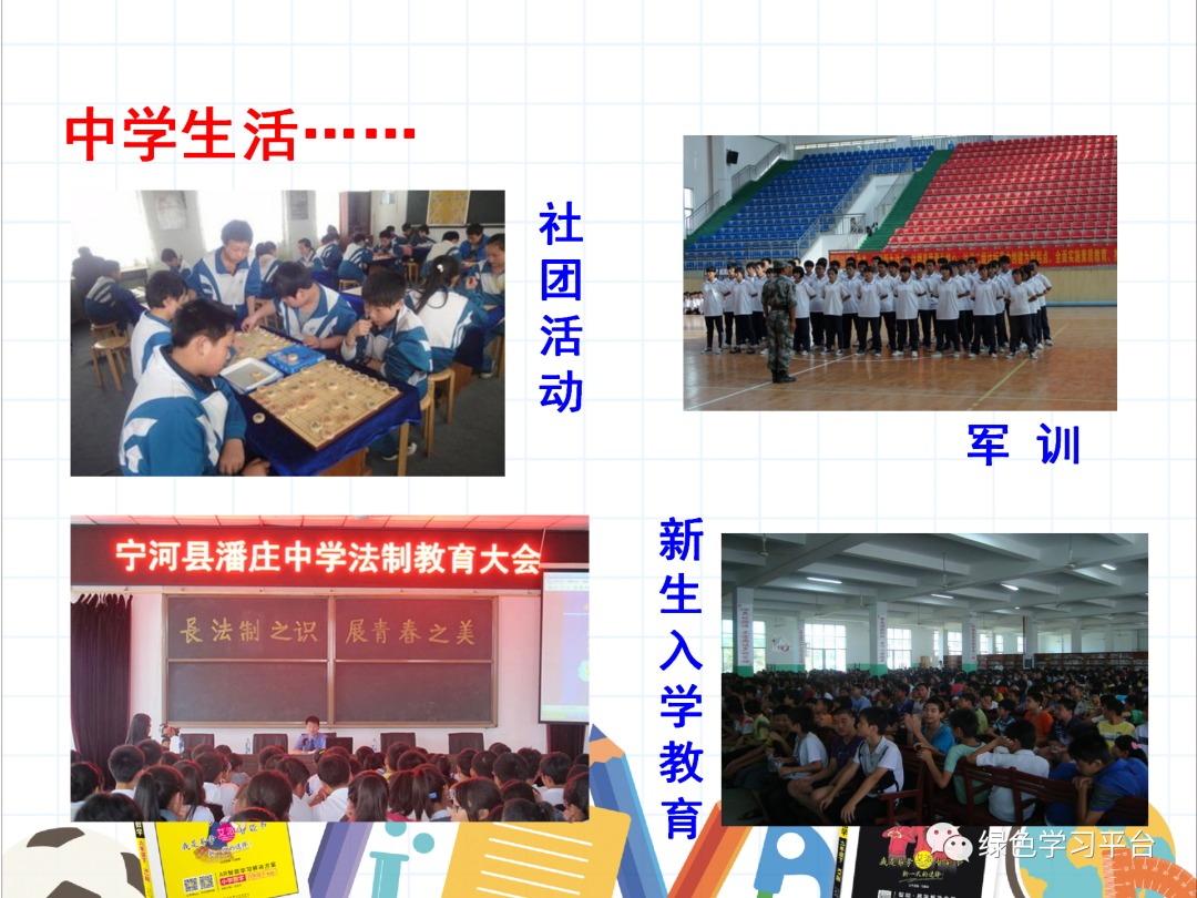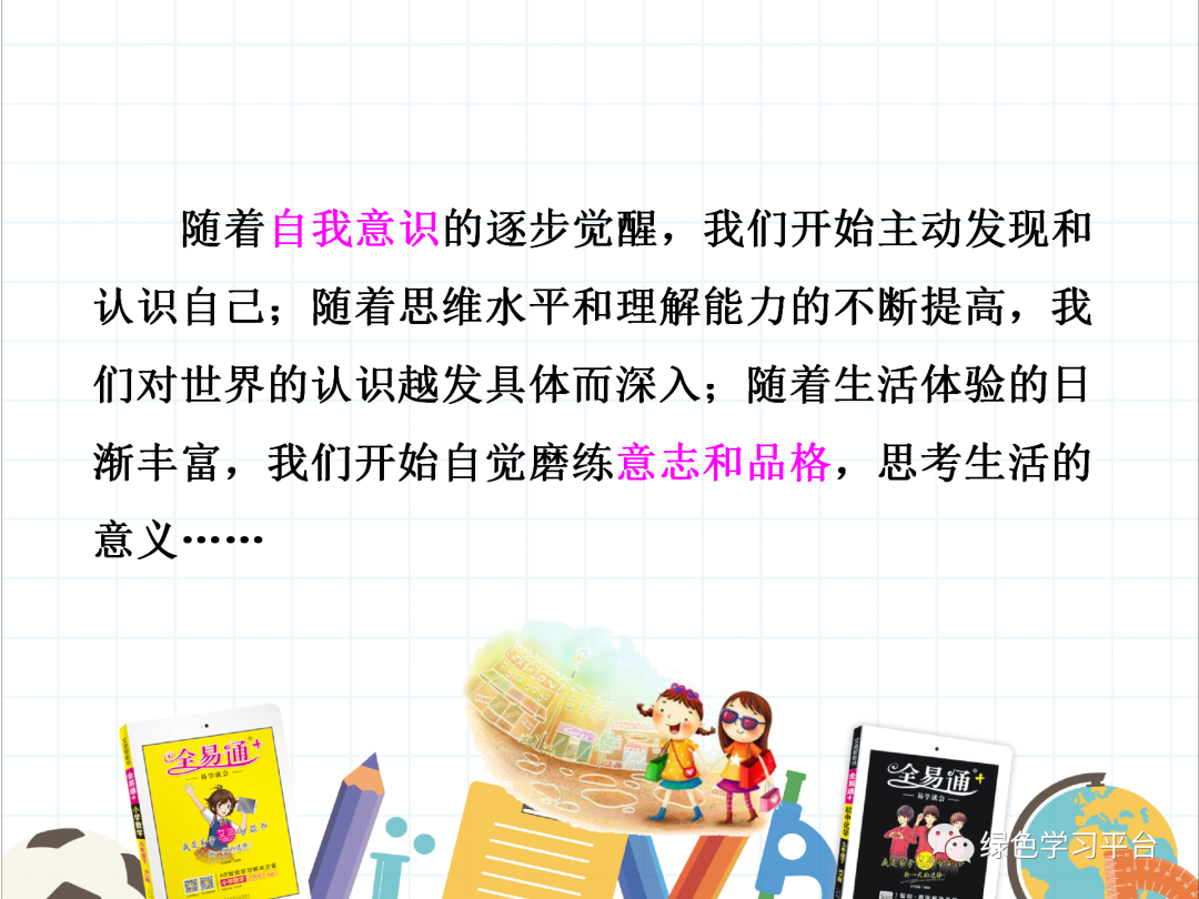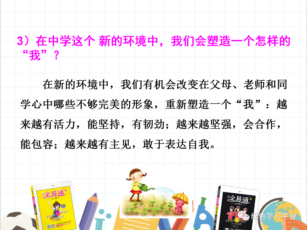 教师总结:进入中学,新的目标和要求激发着我们的潜能,激励着我们不断实现自我超越。中学生活让我们有机会重塑自我。