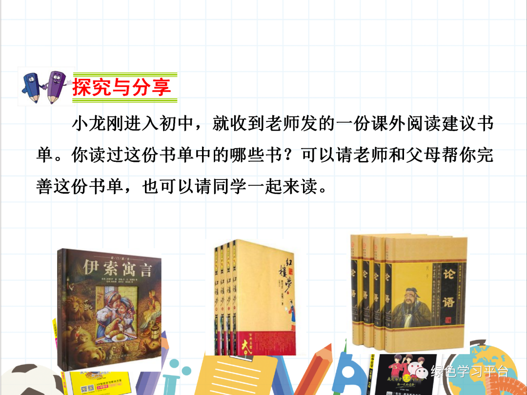 (2)分享交流:请学生说出看了小龙书单的感想,并提问教材所列书单中的书读过几本?