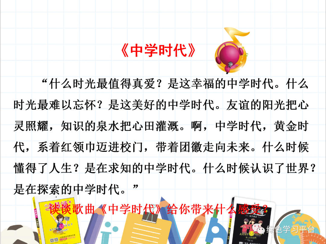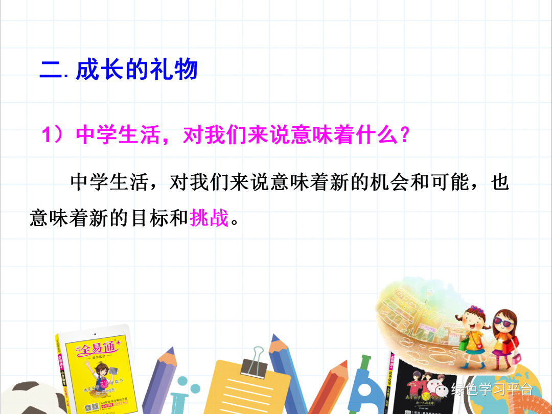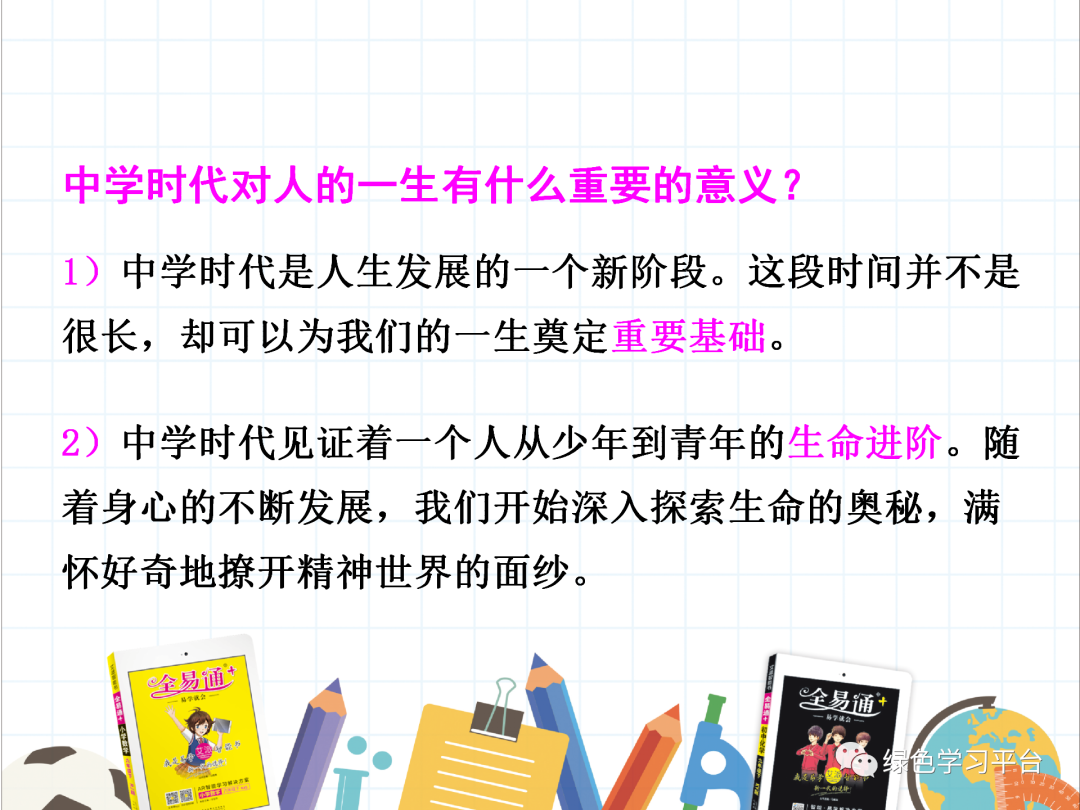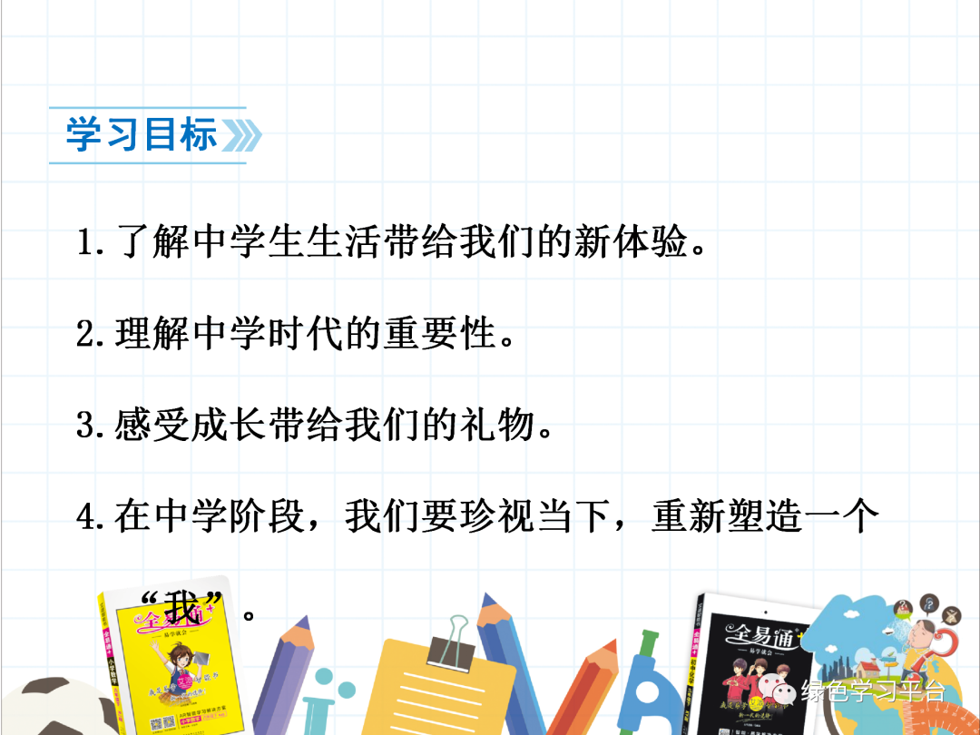 知识目标 | 探寻中学时代的独特价值和意义;懂得中学生活对个人一生的重要性;知道中学生活面临着诸多机遇与挑战 |