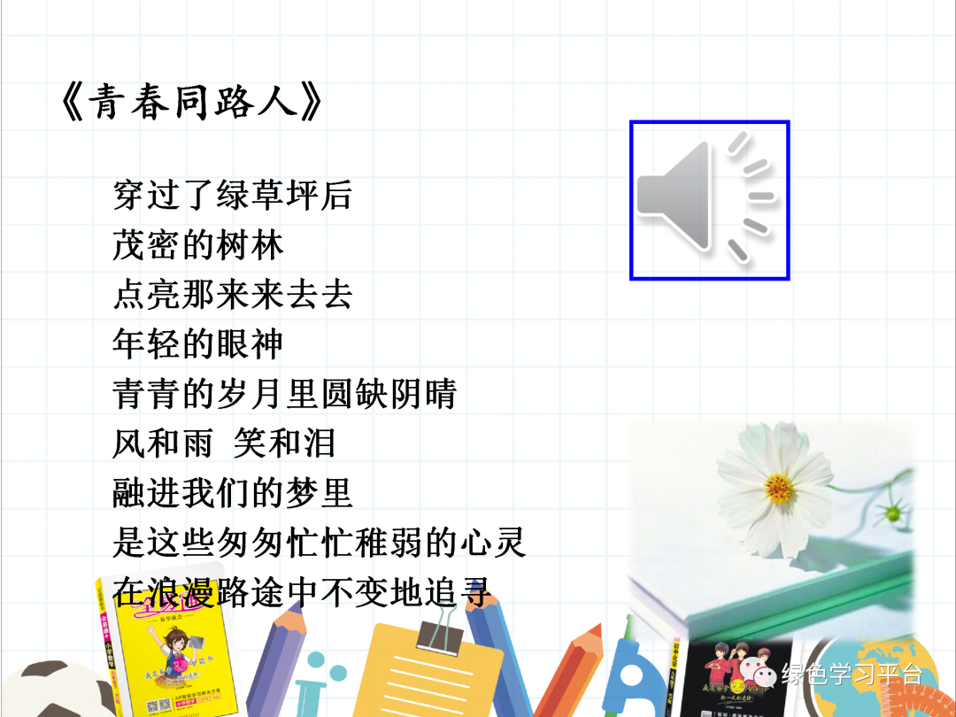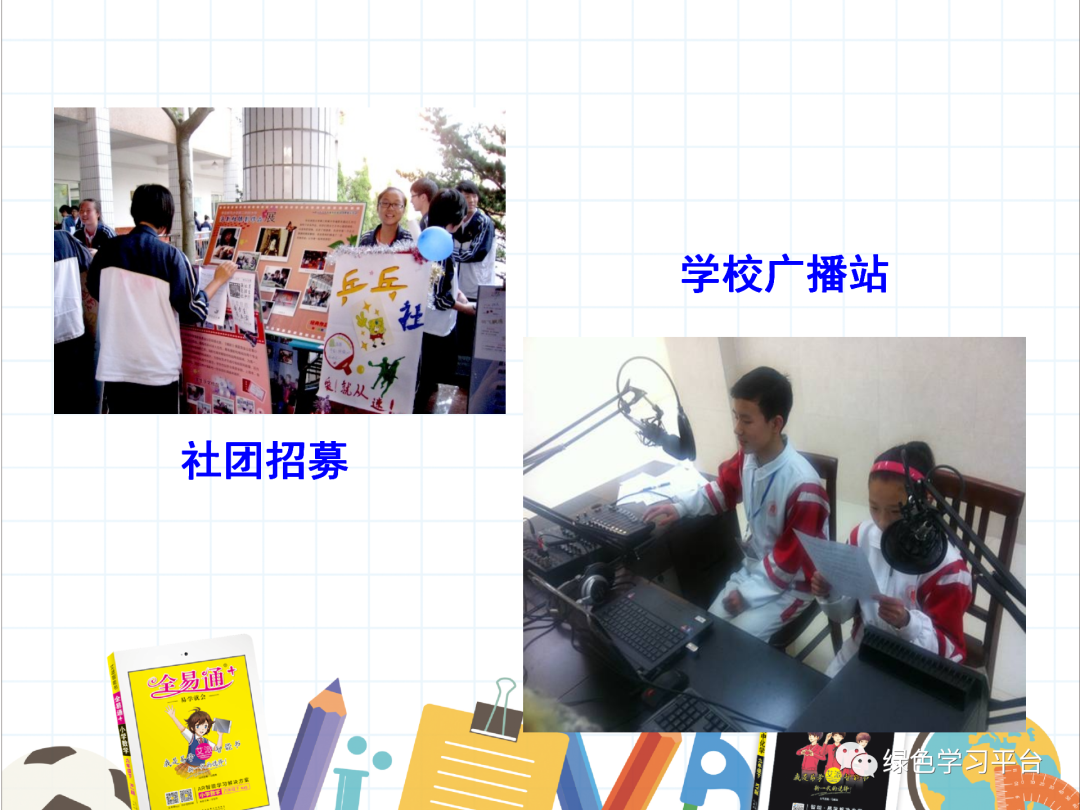 (1)创设情境:播放舒缓的音乐,或者多媒体配上画面,比如校园风景、社团活动、师生风采等。