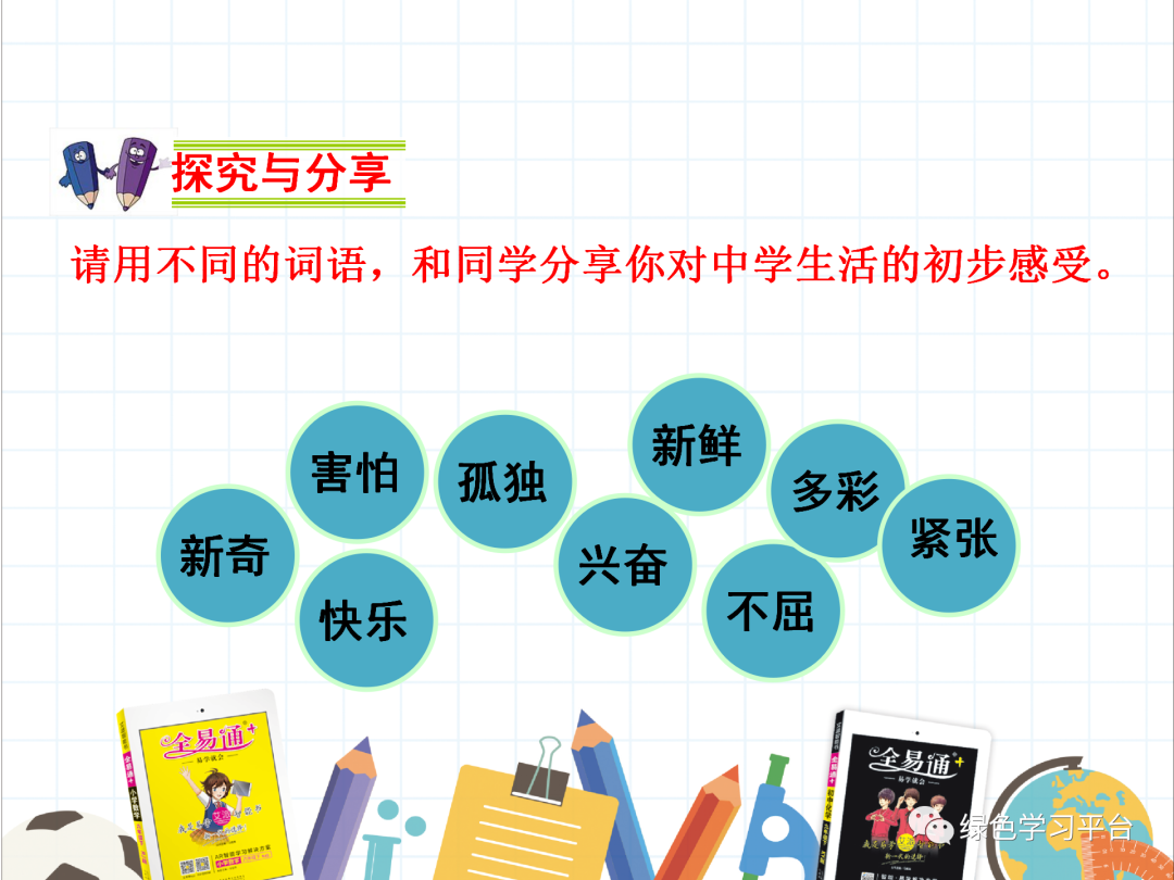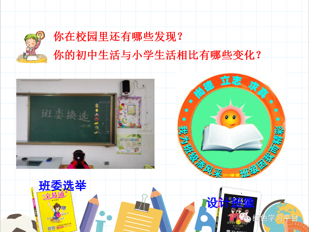 (3)分享交流:你在校园里还有哪些发现?你的初中生活与小学相比有哪些变化?(提醒:请学生尊重每位同学的发言)
