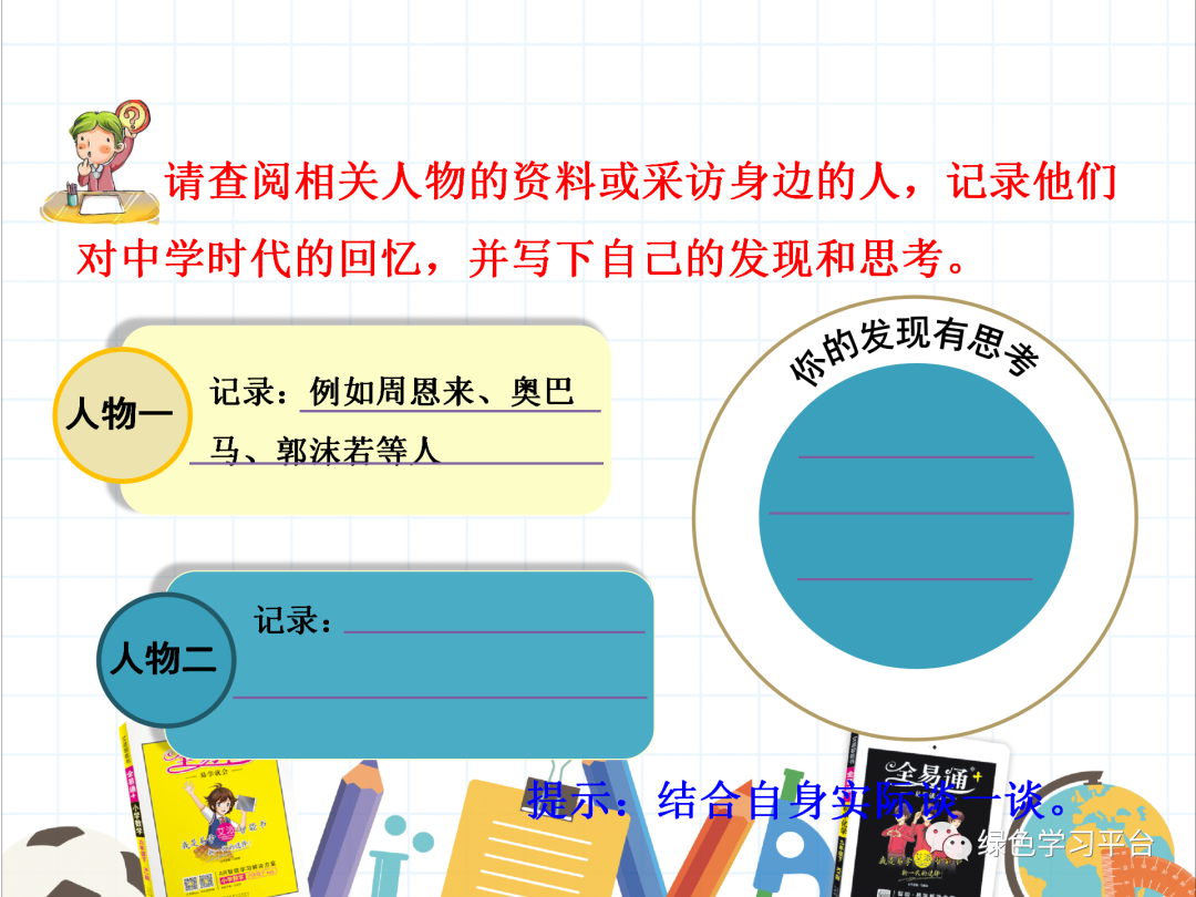 分享感悟:请学生谈谈自己的读后感,也可以根据学生的分享内容进行追问。例如,为什么钱学森对自己的中学生活如此留恋?从哪里可以看出中学生活对他的一生产生了重大影响?