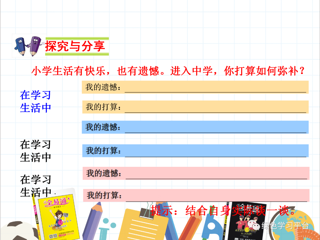 (1)教师引导学生谈谈自己在小学生活中的收获,自然引出“遗憾”的话题。